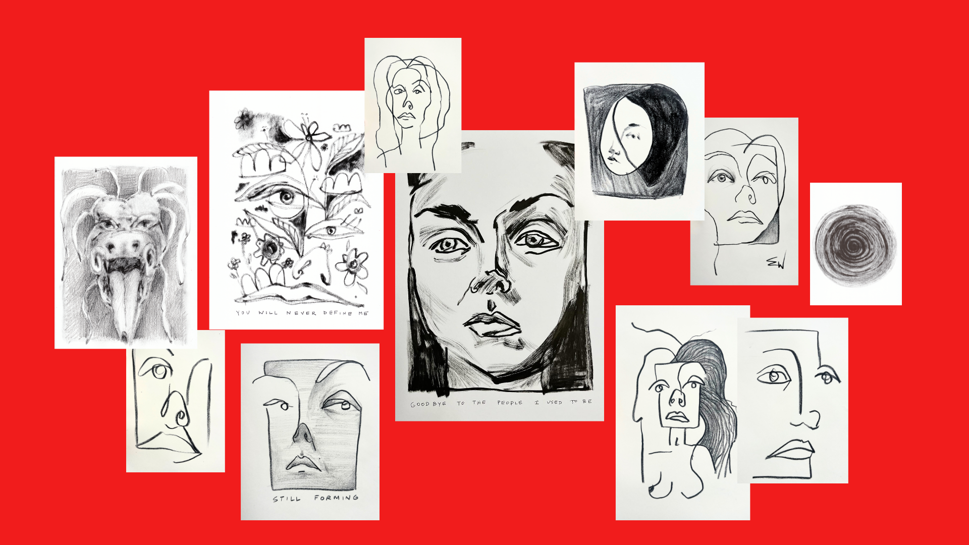 The title came to me after a frantic drawing session in which I drew several self-portaits with my eyes closed. The experience was profound. Each self-portrait felt like a Goodbye as well as a doorway into the next version of myself. From there, the collection of self-portraits grew.